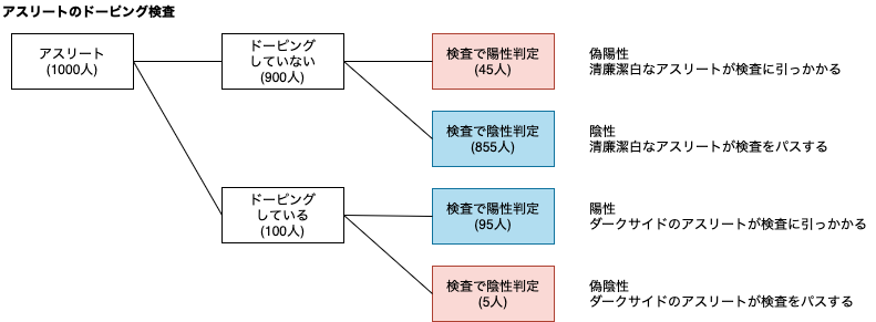 1000人のアスリート(内100人が実際にドーピングをしている)に対して、95%の信頼性があるドーピング検査を実施したときの例です。