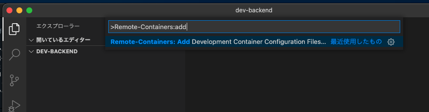 (このディレクトリの中に開発用コンテナ情報とソースコードが格納されます。)VSCodeからコマンドパレットを開き、