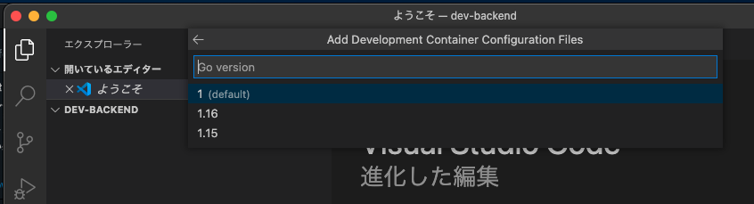 Remote-Containers: Add Development Container Configuration Filesと入力する。 - 開発環境として使用するベースのコンテナとして、