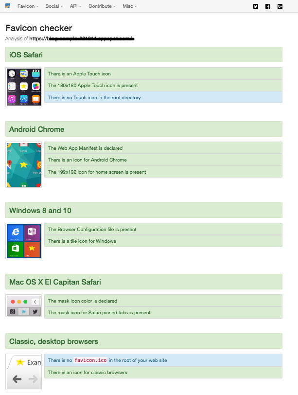 Favicon Generatorでは、各プラットフォームからfaviconにアクセス出来ているかを一括でチェックできるのでとても便利です。